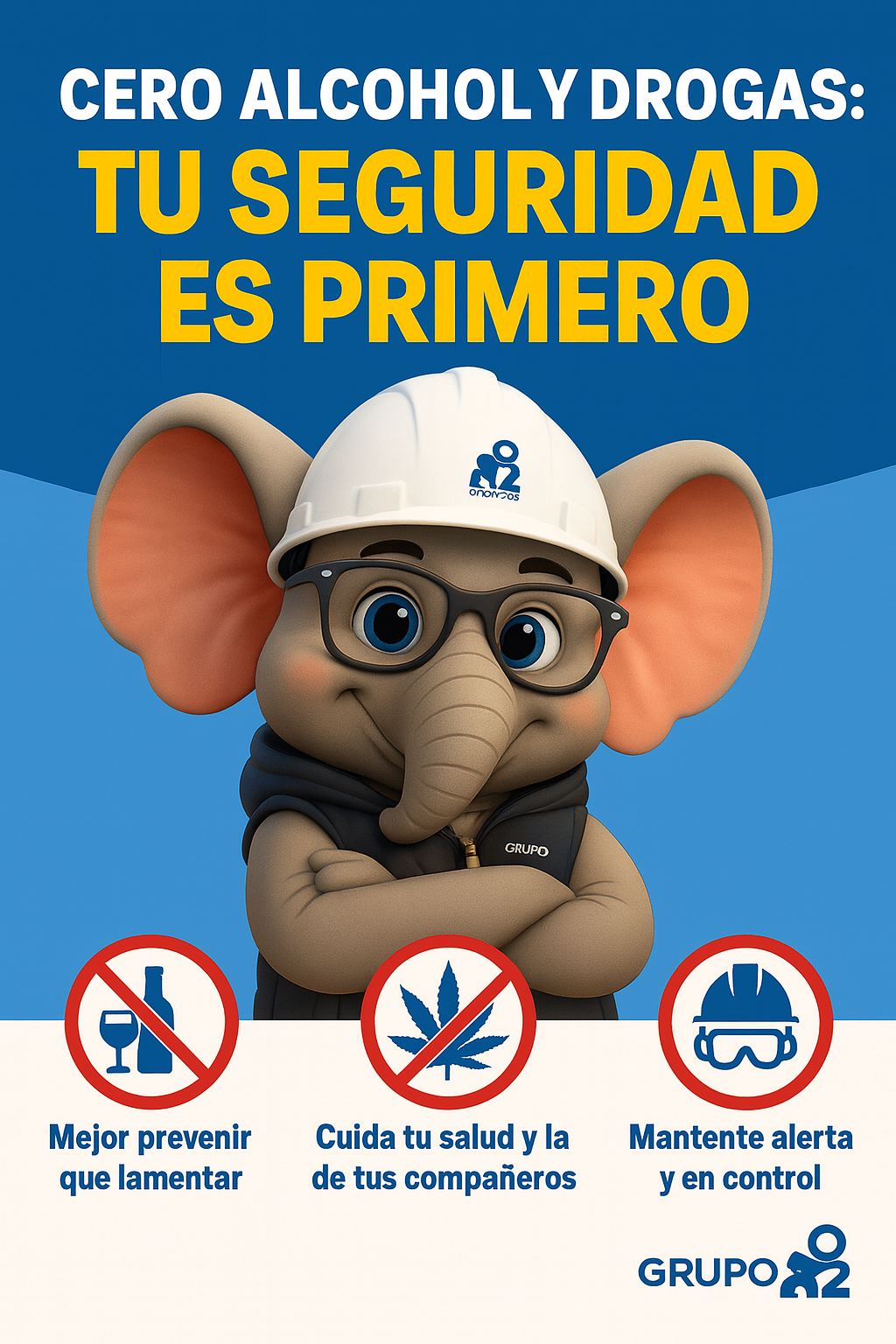 En Grupo-O2 reafirmamos nuestro compromiso con la seguridad, la salud y el bienestar integral de todas las personas que forman parte de nuestras empresas. Por ello, hemos lanzado la campaña COMPROMISO-O2: TRABAJO SEGURO – Cero Riesgo, Cero Alcohol y Drogas, una iniciativa desarrollada en conjunto