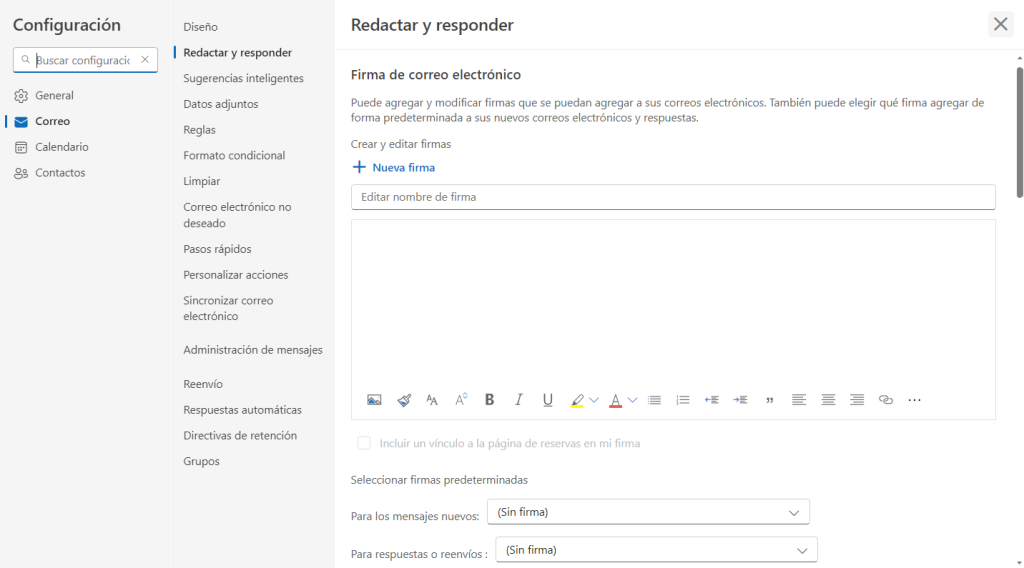 5. Guardan los cambios y seleccionan la firma como predeterminada para correos nuevos y respuestas.